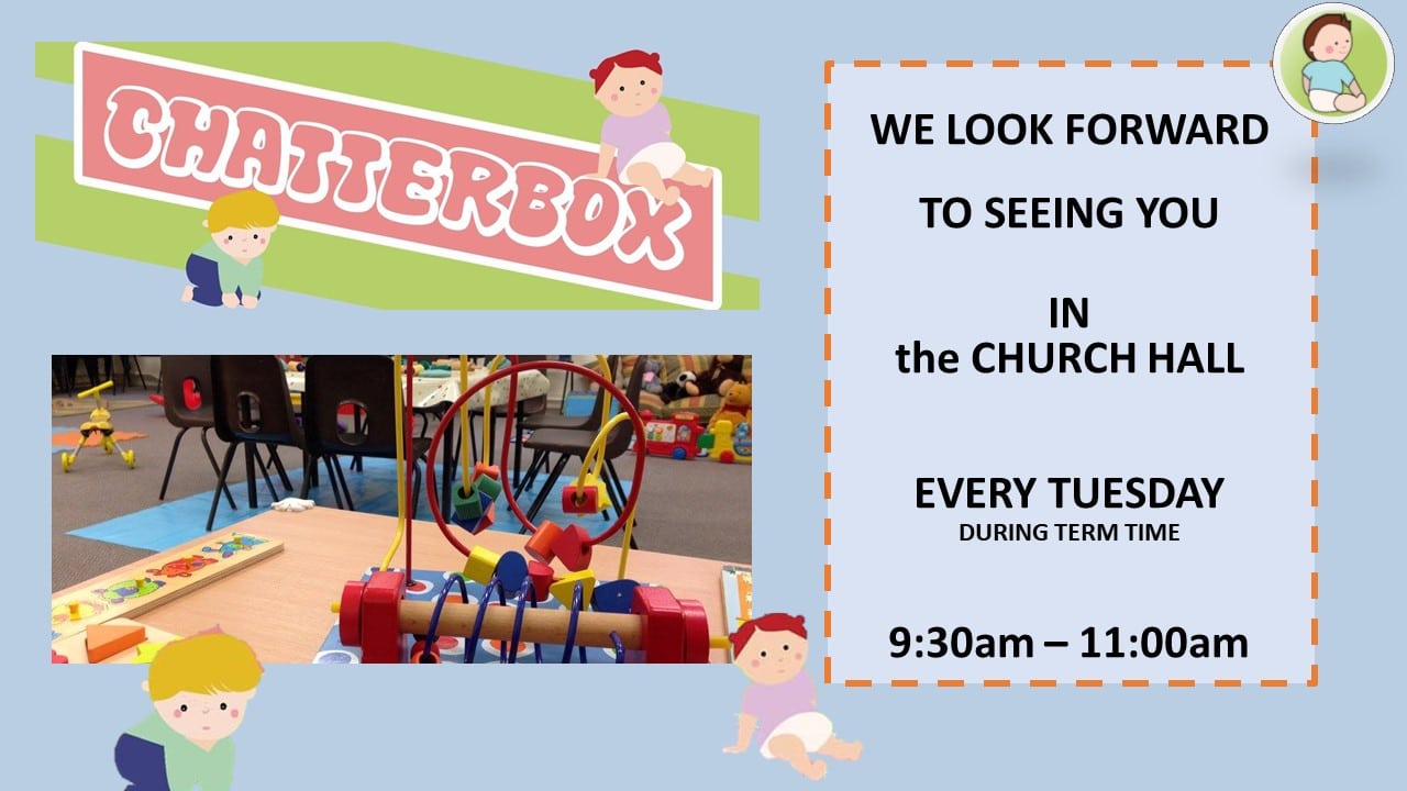 Chatterbox is held during term time, on Tuesday mornings between 9.45 and 11.30 in the hall at the back of the church.